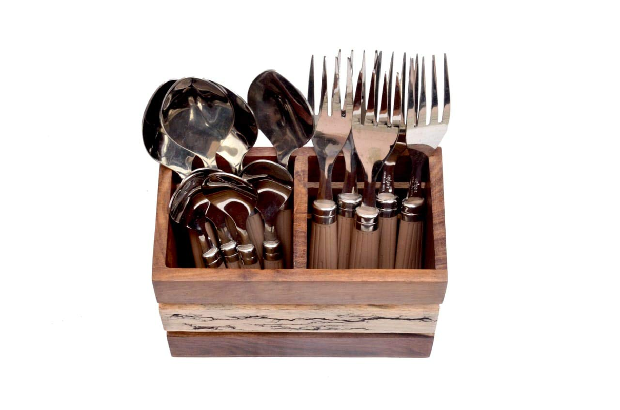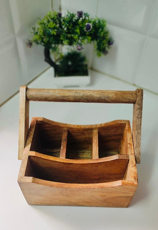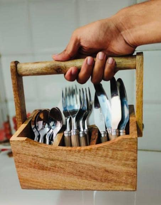 About: trendy way to store your spoons and table accessories; Made of Seasoned mango wood. The Cutlery Holder or Spoon Stand is ideal to keep spoons, forks, knives, tissue papers etc for dining tables for Home or Restaurant, cafe & Hotel use.[Material] Box – Mango Wood, Handles – Wood 1 spoon stand, Weight – 760 gm(approx)